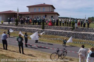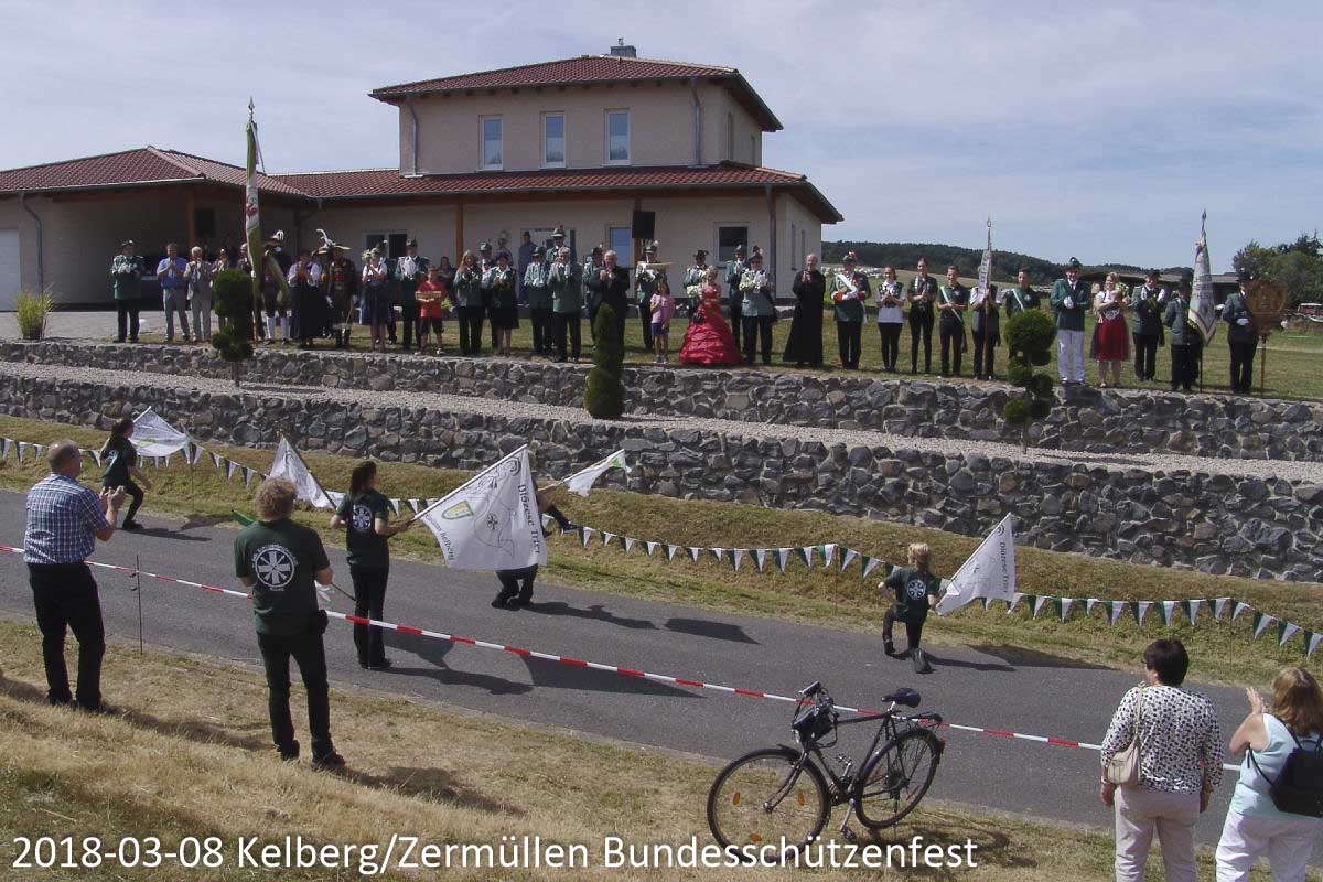 Fotos von den vorbeigehenden Gruppen in Gewändern des Schützenvereins oder der Musikgruppen bei der Veranstaltung bei strahlenden Sonnenschein
